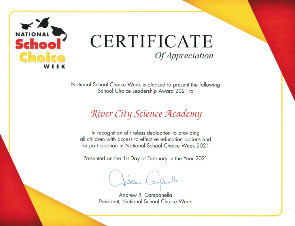 On February 1st, NSCW President Andrew R. Campanella presented RCSA with an award “in recognition of tireless dedication to providing all children with access to effective education options and for participation in National School Choice Week 2021.”