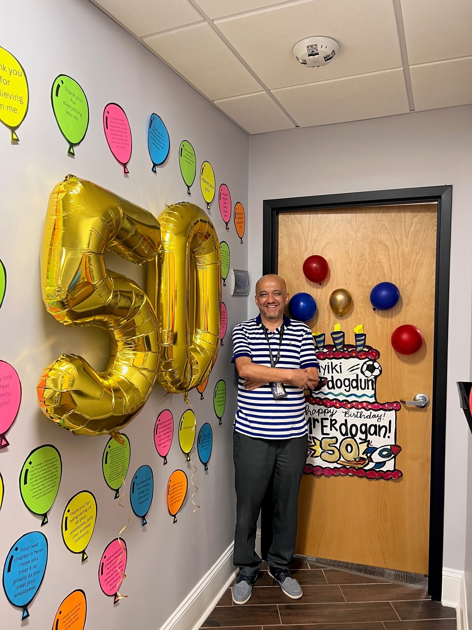 RCSA Innovation partied during morning carline, had a yard sign and cake, decorated his door with MORE cake and 50 balloons for the 50 reasons why we love him (from his staff and HR).