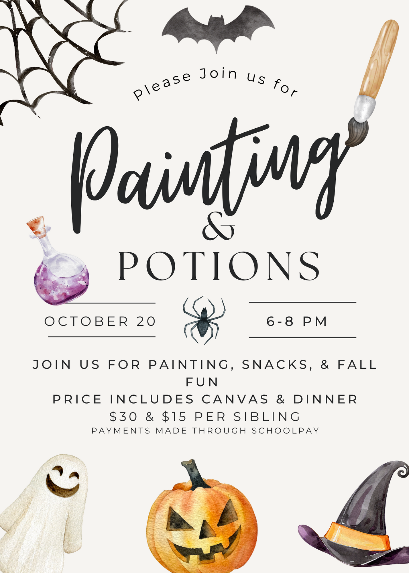 On Friday, October 20th, 2023 aftercare will be hosting their 2nd Annual Painting and Potions. This helps the program raise money for materials and fun themed events. All students are invited to stay from 6-8 (if they are not enrolled in aftercare they can be dropped back off or if they would like to stay, they can use drop-in care) for a night of painting and fall fun. Student will receive dinner and a canvas. They will also participate in fall themed activities.