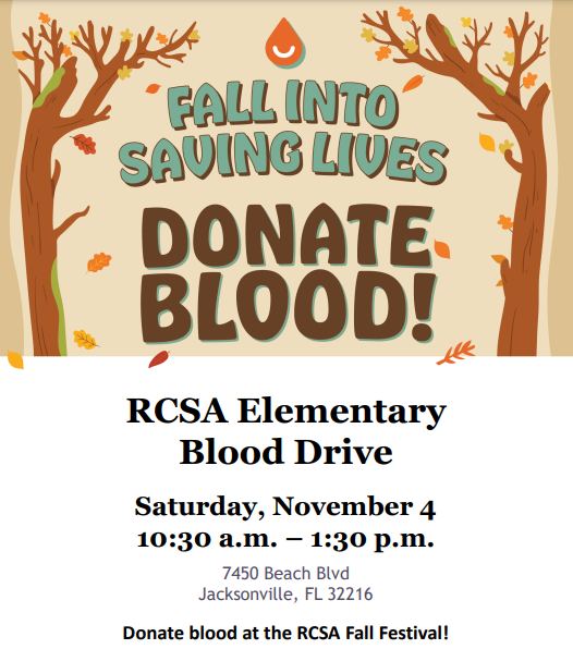 RCSA has partnered with LifeSouth Community Blood Centers and RCSA Elementary will host a blood drive during our Fall Festival on Saturday, November 4th from 10:30 – 1:30.