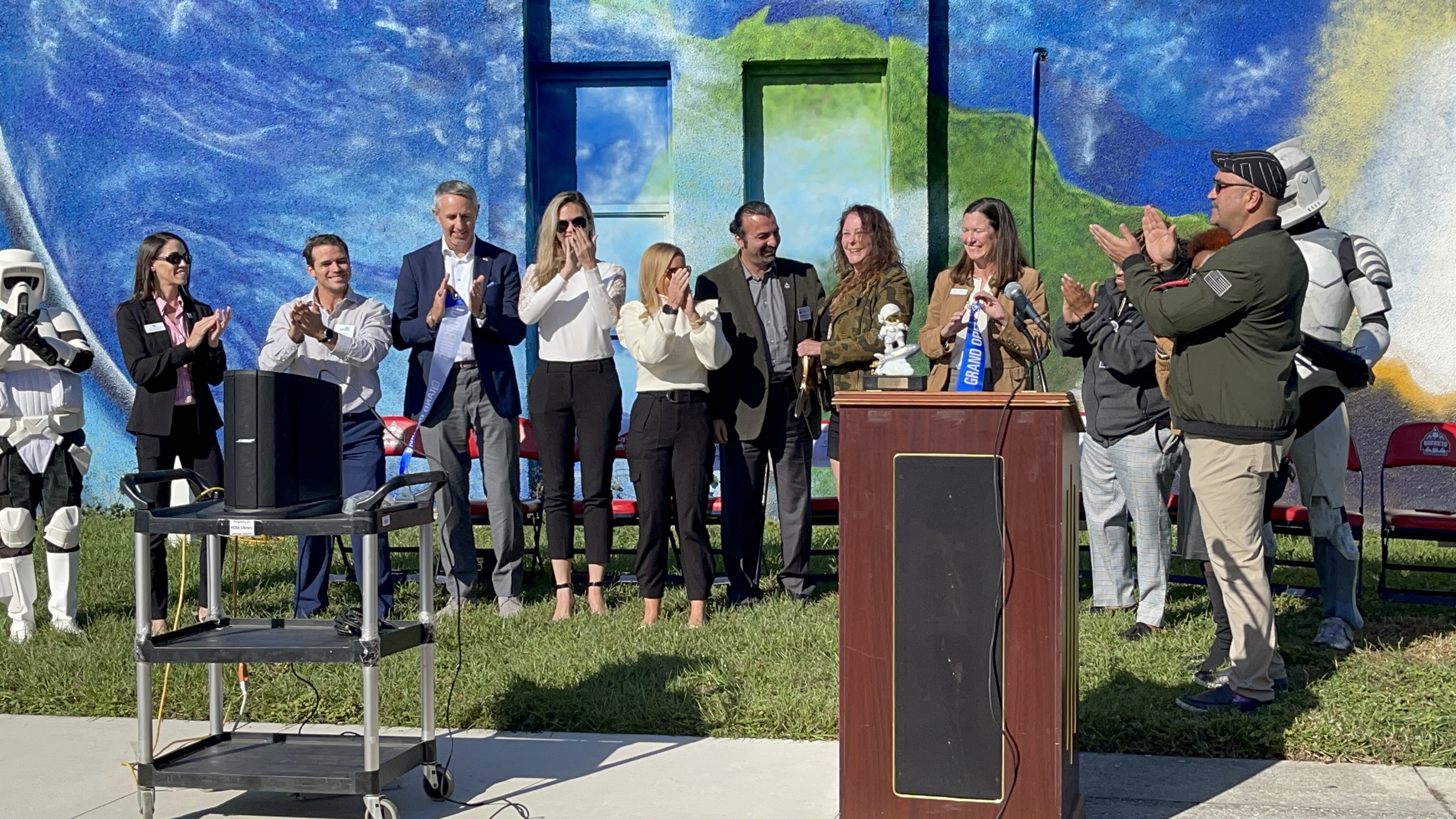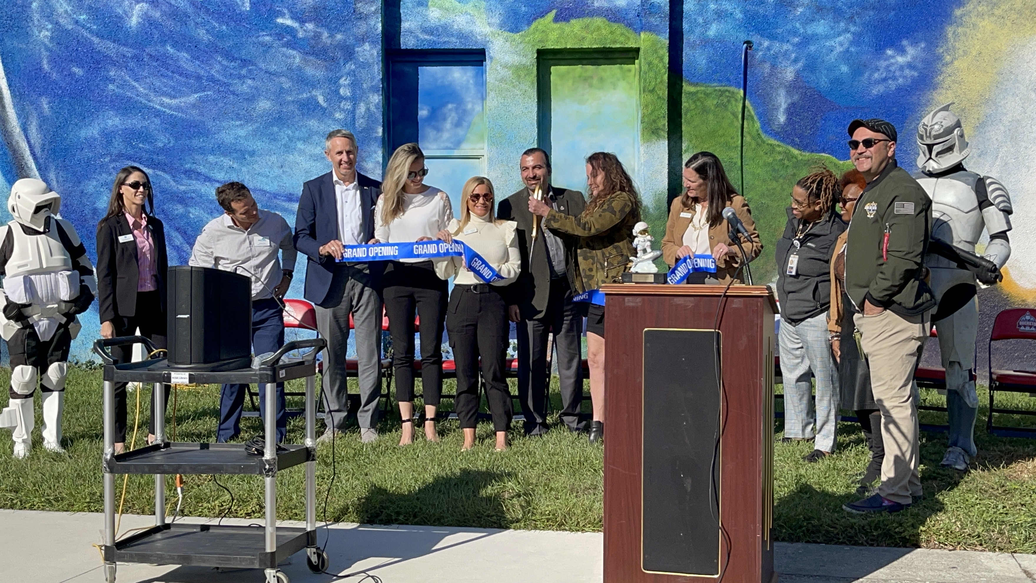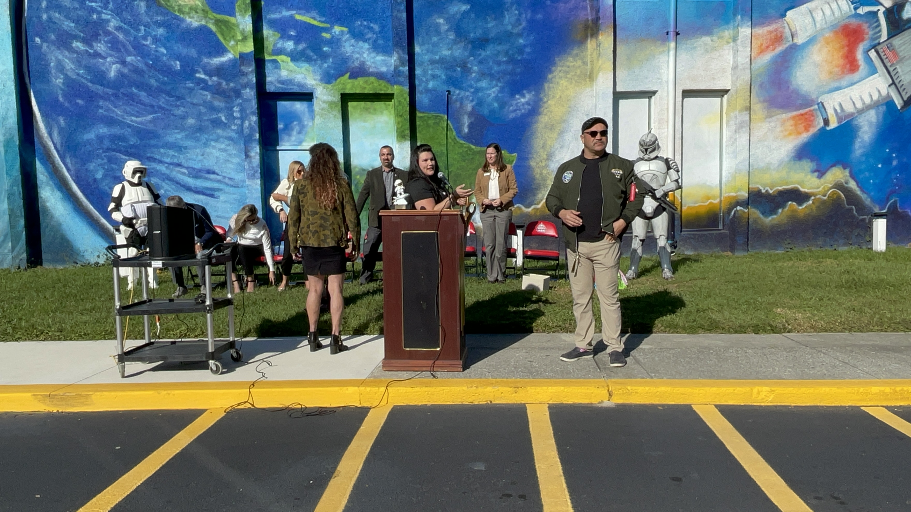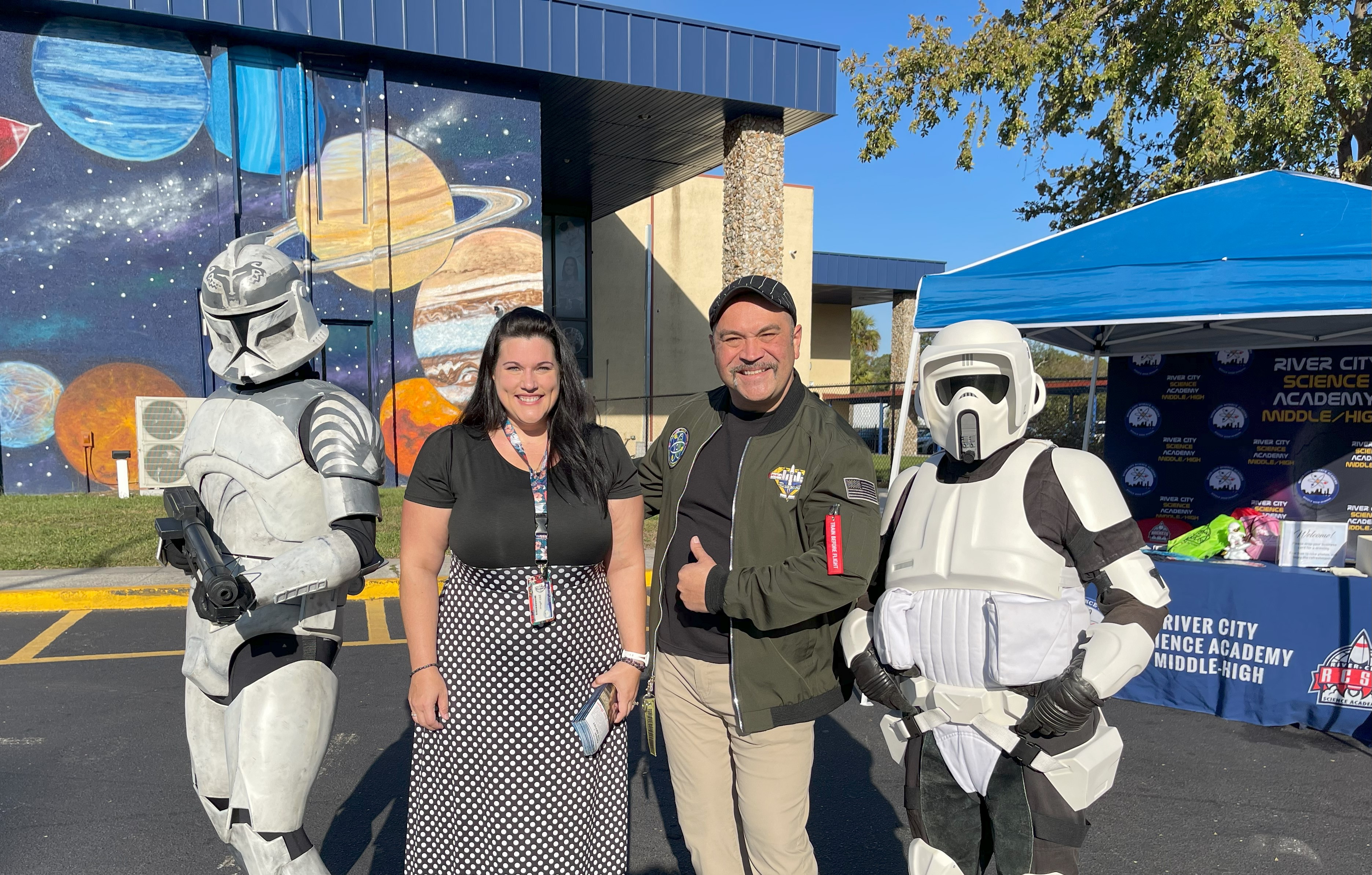 Our Mural Dedication and Ribbon Cutting Ceremony was a huge success. Students and staff were joined by members of our community, elected officials, and a couple of stormtroopers, to dedicate the beautiful mural by Mary Joan Hinson to he community of Jacksonville in the name of STEM and the Arts, innovation, inventions, space exploration, and reaching higher than the sky!