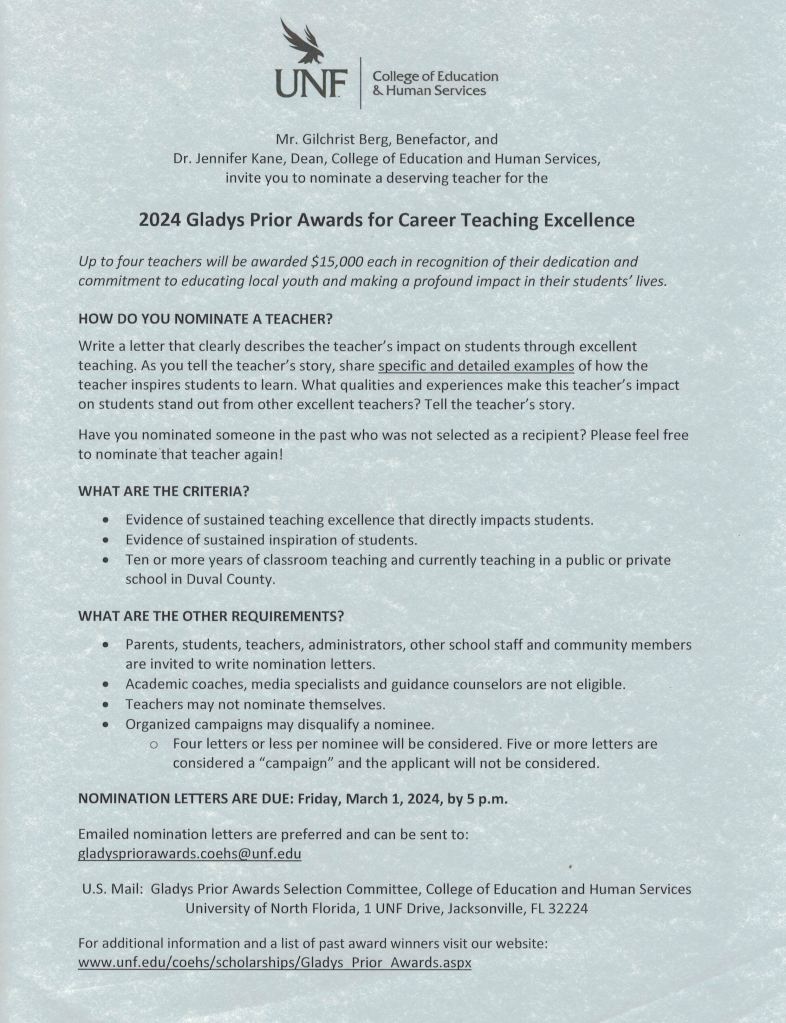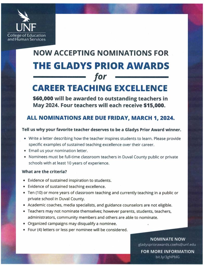 Uncategorized UNF Presents The Gladys Prior Awards for Career Teaching Excellence Posted by RCSA Rocket Link on January 3, 2024 Share this: Click to share on X (Opens in new window) X Click to share on Facebook (Opens in new window) Facebook Like Loading... Related