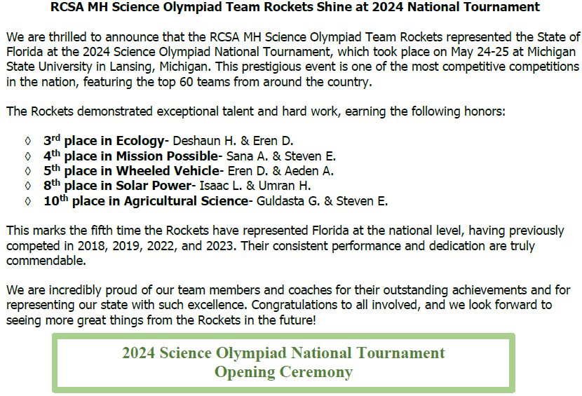 Since 2016, RCSA Mandarin has earned and maintained a school grade of “A”. Thank you to our students, staff, and families for all of your hard work and dedication to the success of RCSAM Rockets. Continue to aim high Rockets!