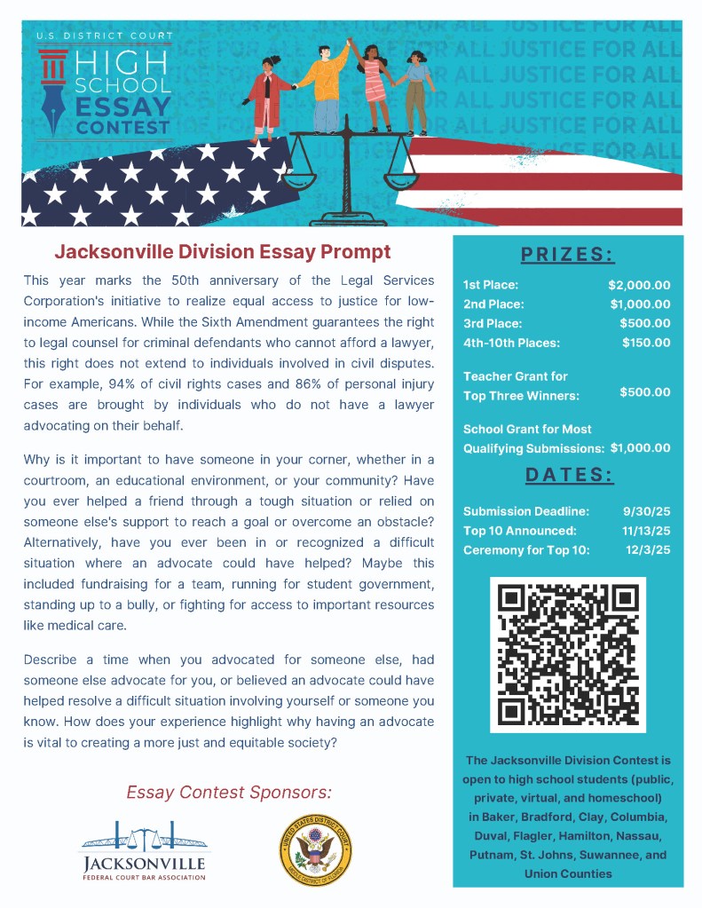 More details about the Essay Contest can be found in the attached flyer and https://www.flmd.uscourts.gov/2025-high-school-essay-contest-jacksonville-homepage