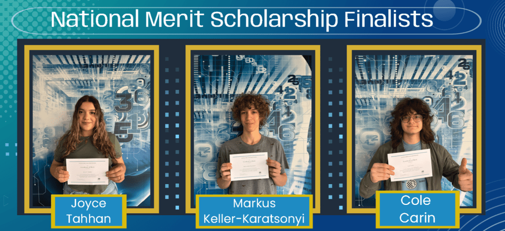 We proudly congratulate Joyce Tahhan, Markus Keller-Karatsonyi, and Cole Carin for being named National Merit Scholarship Finalists, one of the highest academic honors for high school students in the United States.