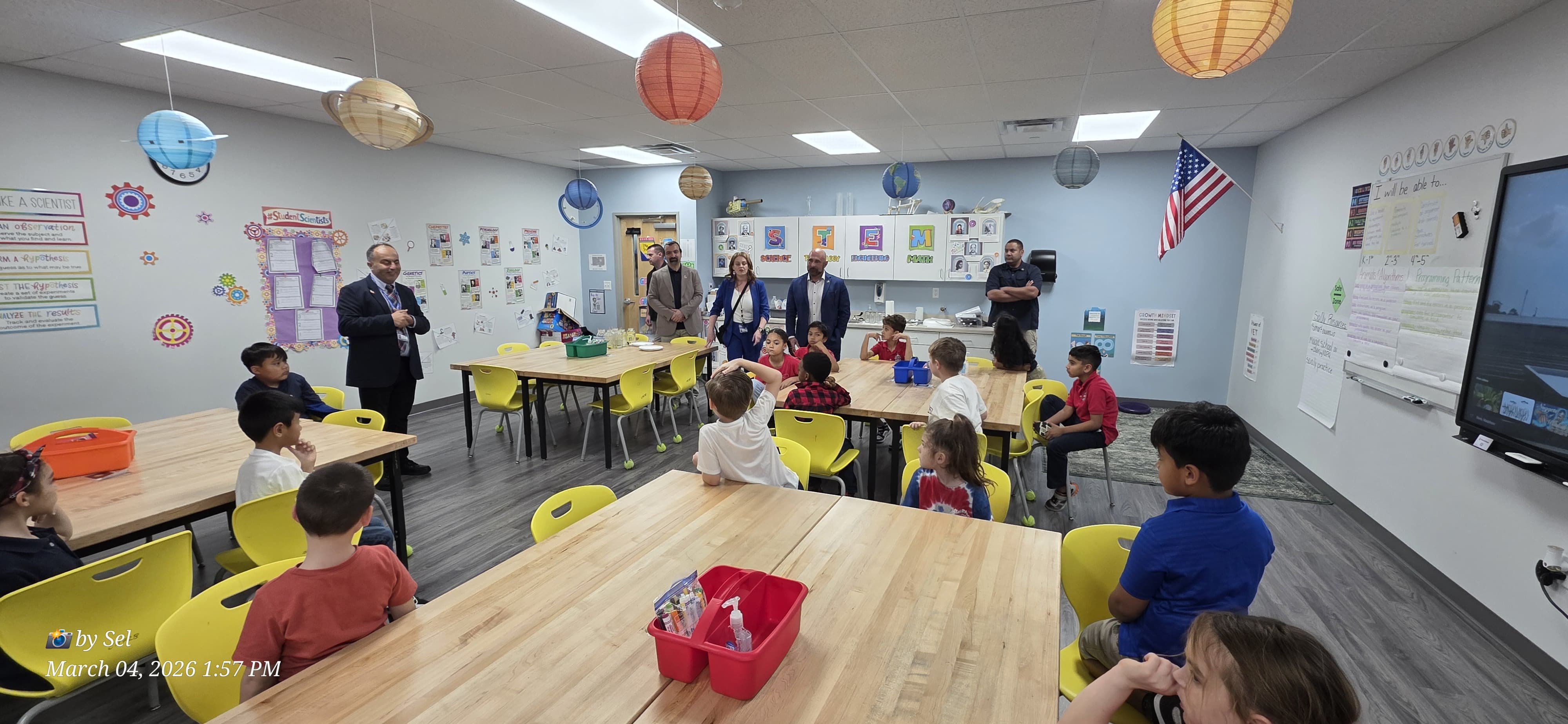 During his visit, Collins also spent time in several classrooms across the campus. In a kindergarten classroom, he spoke with students about the meaning of the Pledge of Allegiance, helping them explore vocabulary such as “republic” and discussing how civic values help protect the freedoms and rights of citizens.