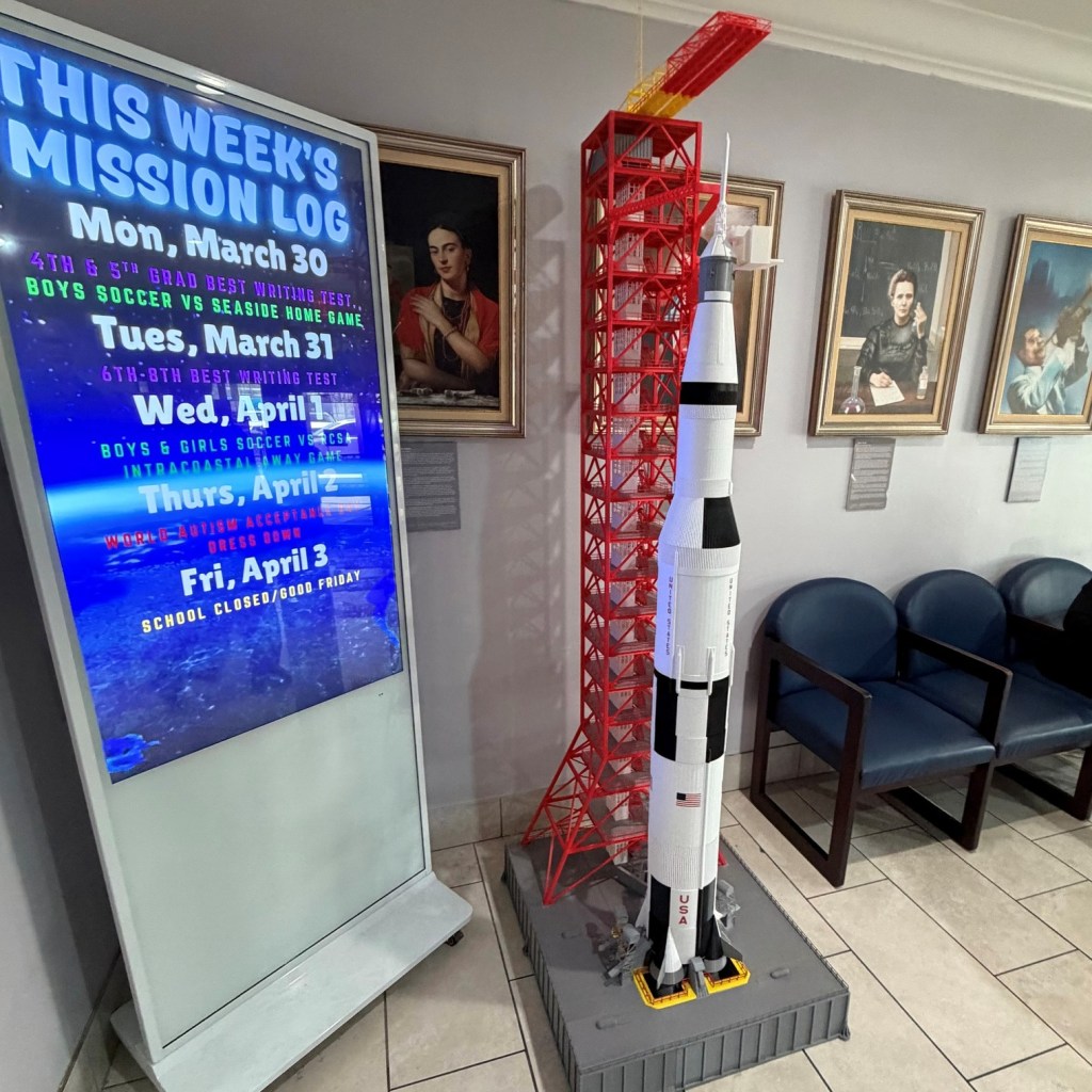 Provided by a talented local artist, this piece is more than just a display – it’s an interactive learning tool that brings engineering, physics, and space exploration to life for our students. It stands as a powerful symbol of RCSA’s commitment to space education and hands-on STEM experiences.